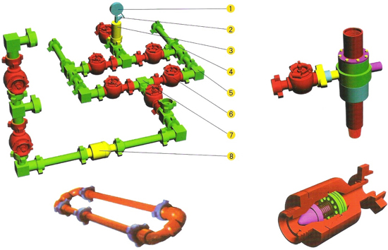 Used  to  control  fluid  pressure  and  flow-rate . Rigid  manifold  is  joined  with  control  head  upwards  and  connected  with  separator  and  blowout  pipeline  downwards .