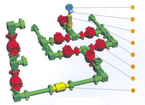 在測試過程中,地層流體經(jīng)鉆桿或油管流到地面之后,必須要有控制裝置引導(dǎo)到分離器和燃燒器中。此裝置稱為地面控制裝置。它可以安全有效地控制流體的壓力和流量。 一、控制頭 控制頭連接在測試管柱的最上部,分為旋轉(zhuǎn)的和不旋轉(zhuǎn)的兩種。根據(jù)其承壓能力可分為35Mpa、70Mpa和105Mpa三種。控制頭既可讓管柱內(nèi)高壓液流流出,也可向井內(nèi)泵入流體。 二、鉆臺(tái)管匯 用于控制流體壓力、流量的管匯。上接控制頭,下連分離器、放噴管線。 鉆臺(tái)管匯的工作壓力分為35Mpa、70Mpa和105Mpa。相應(yīng)的試驗(yàn)壓力為70Mpa、105Mpa和140Mpa。 三、活動(dòng)管匯 用于連接控制頭、鉆臺(tái)管和放噴管線的高壓活動(dòng)管匯。它由特制加厚無縫鋼管和由壬及活動(dòng)彎頭組成。 管匯工作壓力分為35Mpa、70Mpa和105Mpa。相對應(yīng)的試驗(yàn)壓力為70Mpa、105Mpa和140Mpa。 活動(dòng)管匯要定期檢查、潤滑、更換密封圈和進(jìn)行液壓密封檢驗(yàn),確保測試安全。